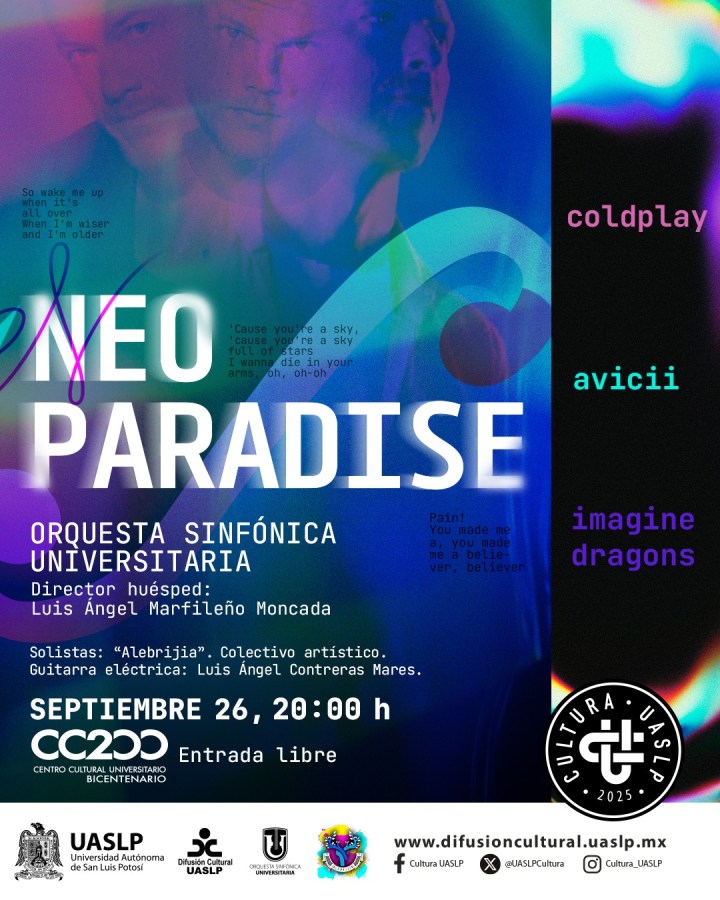 La Universidad Autónoma de San Luis Potosí, a través de la Secretaría de Difusión Cultural, invita al concierto de la Orquesta Sinfónica Universitaria “Neo Paradise”, bajo la dirección del maestro huésped Luis Ángel Marfileño Moncada. La cita es el viernes 26 de septiembre a las 20:00 horas en el Centro Cultural Universitario Bicentenario, con entrada libre.