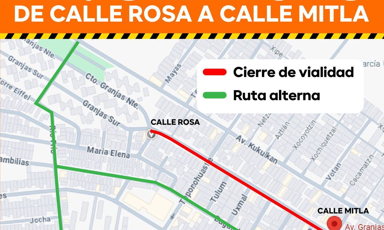 El Gobierno de la Capital, a través de la Dirección de Obras Públicas, informa a la ciudadanía que este miércoles se llevará a cabo un cierre parcial en la avenida Granjas, en el tramo comprendido entre calle Rosa a calle Mitla, en la colonia Industrial Aviación 3ª sección.