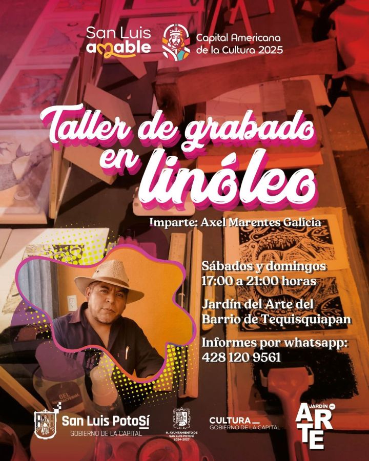 en el “Taller de grabado en linóleo”, que se lleva a cabo todos los sábados y domingos en el Jardín del Arte del barrio de Tequisquiapan de San Luis Potosí, en un horario de 17:00 a 21:00 horas.