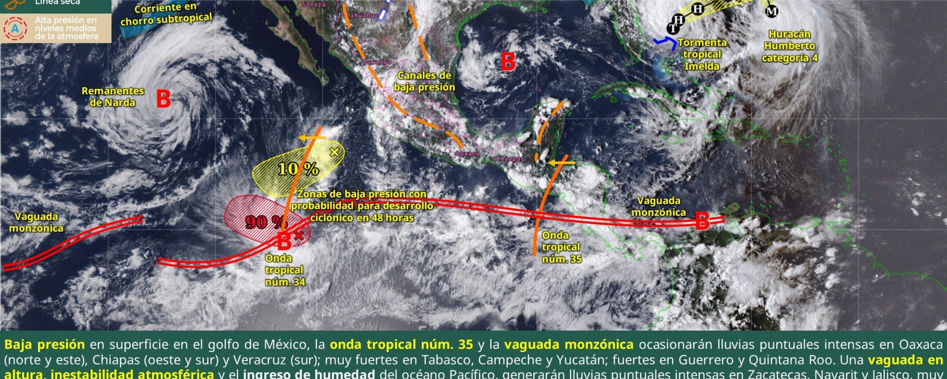 Lluvias fuertes con puntuales muy fuertes (50 a 75 mm): Durango, Zacatecas, Aguascalientes, Nayarit, Jalisco, Michoacán, Guerrero, Oaxaca, Tabasco, Campeche, Yucatán y Quintana Roo.