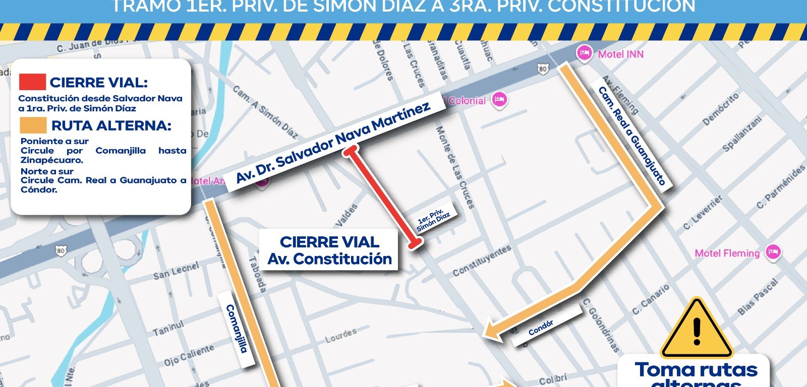 • Para garantizar la seguridad de los transeúntes y vecinos, la entrada a la avenida Constitución desde Salvador Nava se encuentra cerrada, por lo que se establecieron vías alternas.