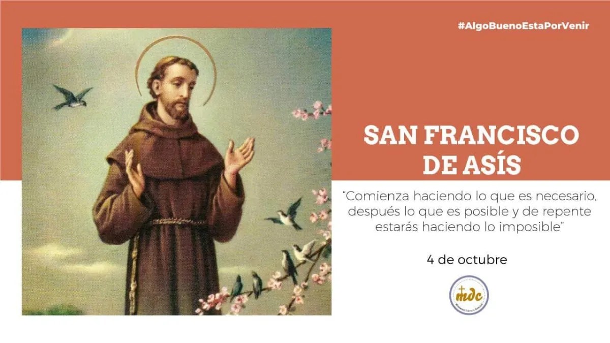 Nació en Asís (Italia), en el año 1182. Después de una juventud disipada en diversiones, se convirtió, renunció a los bienes paternos y se entregó de lleno a Dios. Abrazó la pobreza y vivió una vida evangélica, predicando a todos el amor de Dios. Dio a sus seguidores unas sabias normas, que luego fueron aprobadas por la Santa Sede. Fundó una Orden de frailes y su primera seguidora mujer, Santa Clara que funda las Clarisas, inspirada por El.