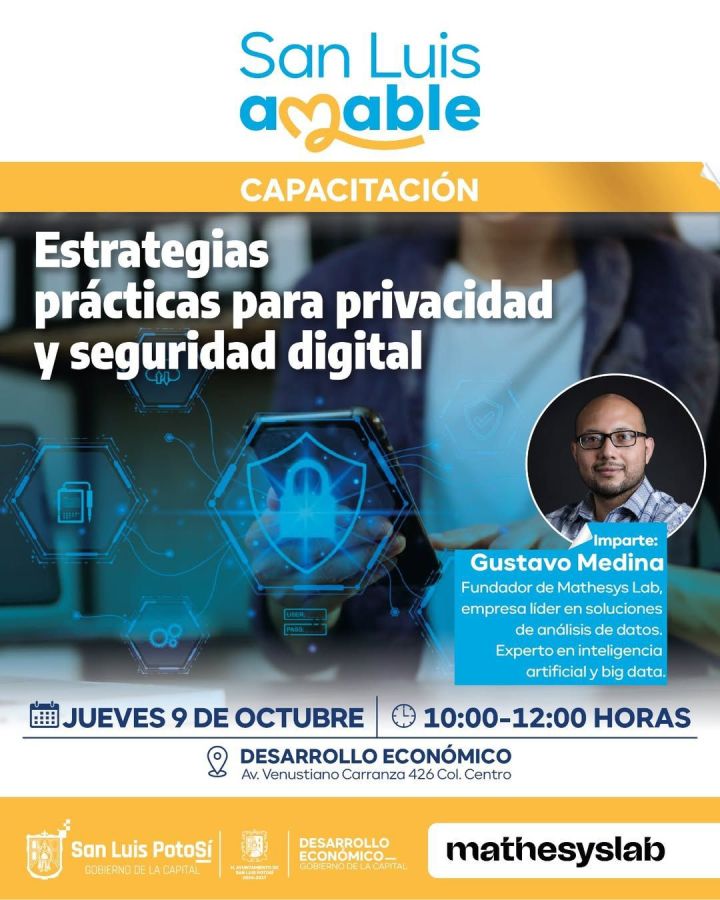 El Gobierno Municipal de San Luis Potosí, a través de la Dirección de Desarrollo Económico, organiza la capacitación «Estrategias prácticas para privacidad y seguridad digital». Esta sesión gratuita busca equipar a la ciudadanía con herramientas esenciales para navegar de forma segura en el mundo digital.