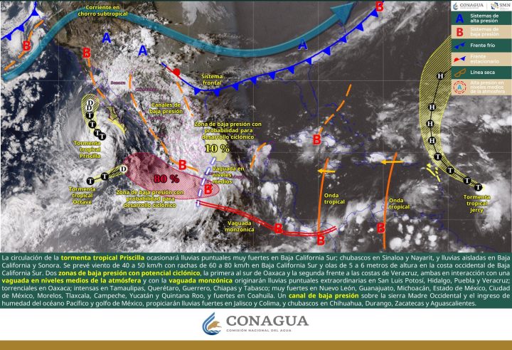 Chubascos con lluvias puntuales fuertes (25 a 50 mm): Baja California, Baja California Sur, Sonora, Jalisco, Colima, Michoacán, Ciudad de México, Tlaxcala, Morelos, Campeche, Yucatán y Quintana Roo.
