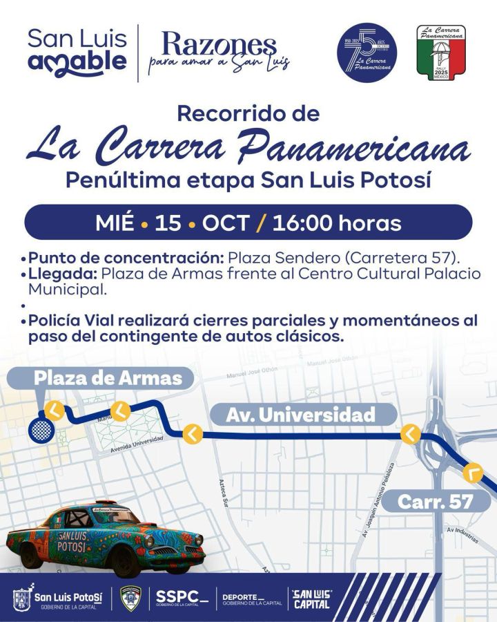 La tradicional Carrera Panamericana llegará mañana a San Luis Potosí, consolidando al municipio como una de las sedes importantes de esta competencia internacional. Se trata de la cuarta vez que el Gobierno de la Capital, encabezado por el Alcalde Enrique Galindo Ceballos, atrae el evento como parte de la estrategia de atracción turística y deportiva.