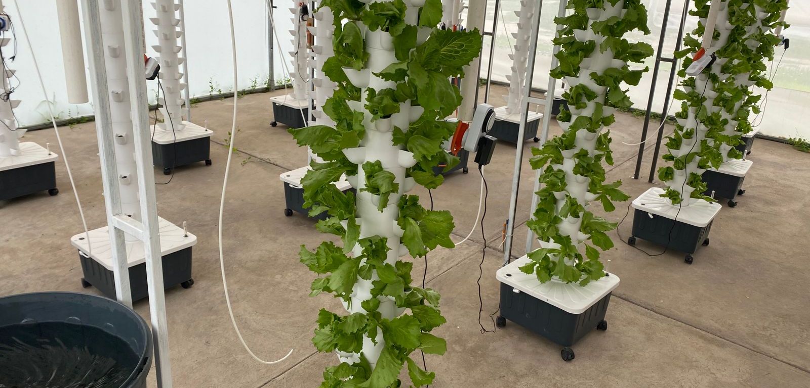 La infraestructura incluye sistemas de cultivo en torres verticales GrowPipes, con capacidad de hasta 300 plantas por torre, así como torres hidropónicas TIRUSS, optimizadas para fertirriego y producción de alta densidad.