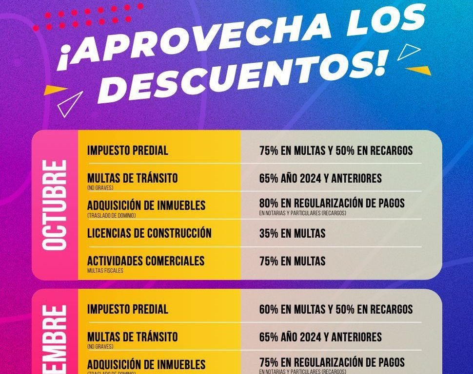 Las multas de tránsito no graves tendrán un descuento del 65 por ciento durante todo el periodo (octubre a diciembre; mientras que en los recargos por adquisición de inmuebles -Traslado de dominio-, se inicia con un 80 % de descuento en octubre; el 75 % en noviembre y 50 en diciembre.