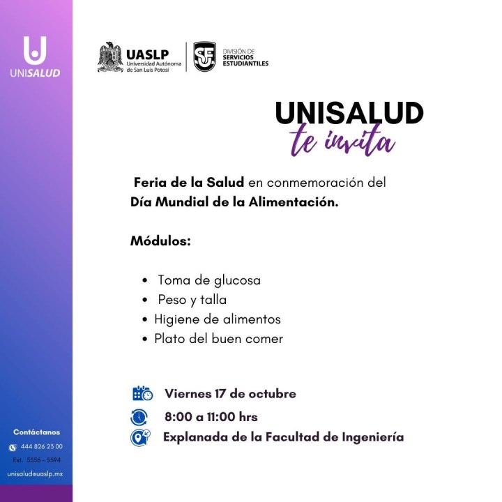 Ambas especialistas invitaron a la comunidad universitaria y al público en general a asistir a la Feria de la Alimentación, que se llevará a cabo el viernes 17 de octubre de 8 a 11 de la mañana en la Facultad de Ingeniería. Durante el evento se realizarán valoraciones de glucemia capilar, presión arterial, módulos informativos sobre higiene, el plato del buen comer y el buen beber, así como consejos prácticos para una dieta saludable en casa o en el trabajo. Además, se llevará a cabo la recolección de tapitas plásticas con fines solidarios.