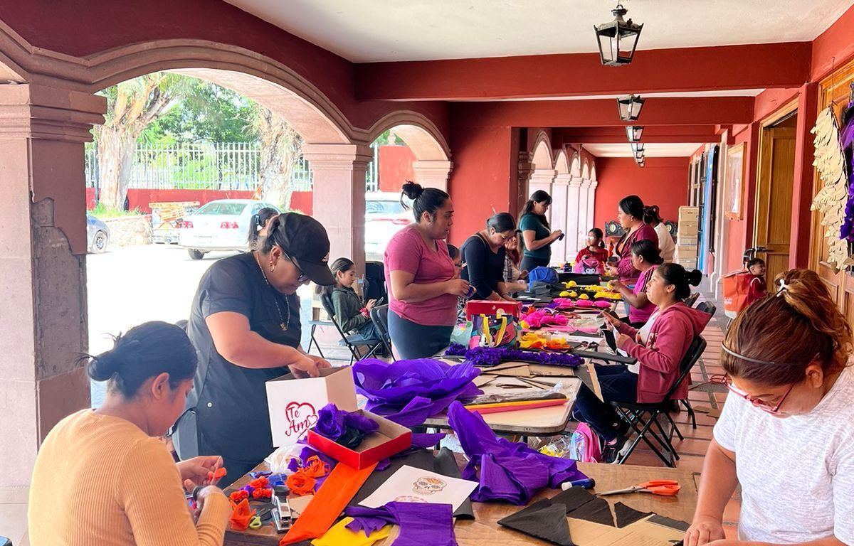 Con motivo del próximo 2 de noviembre, Día de Muertos, la Delegación La Pila del Ayuntamiento de San Luis Capital organiza talleres en sus oficinas municipales, donde personas de todas las edades elaboran flores de papel, calaveritas y otros adornos típicos que llenan de color esta tradicional festividad mexicana.