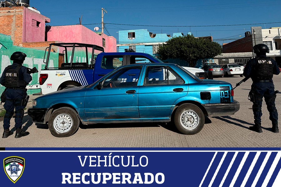 La segunda unidad se localizó en la calle Tolomeo de la colonia Nueva Progreso, al realizar recorridos de prevención. Se trata de un vehículo marca Nissan Tsuru color azul que presentaba huellas de desvalijamiento. Ante ello, los oficiales consultaron la base de datos policial del C4 Municipal, informando que contaba con reporte vigente de robo.