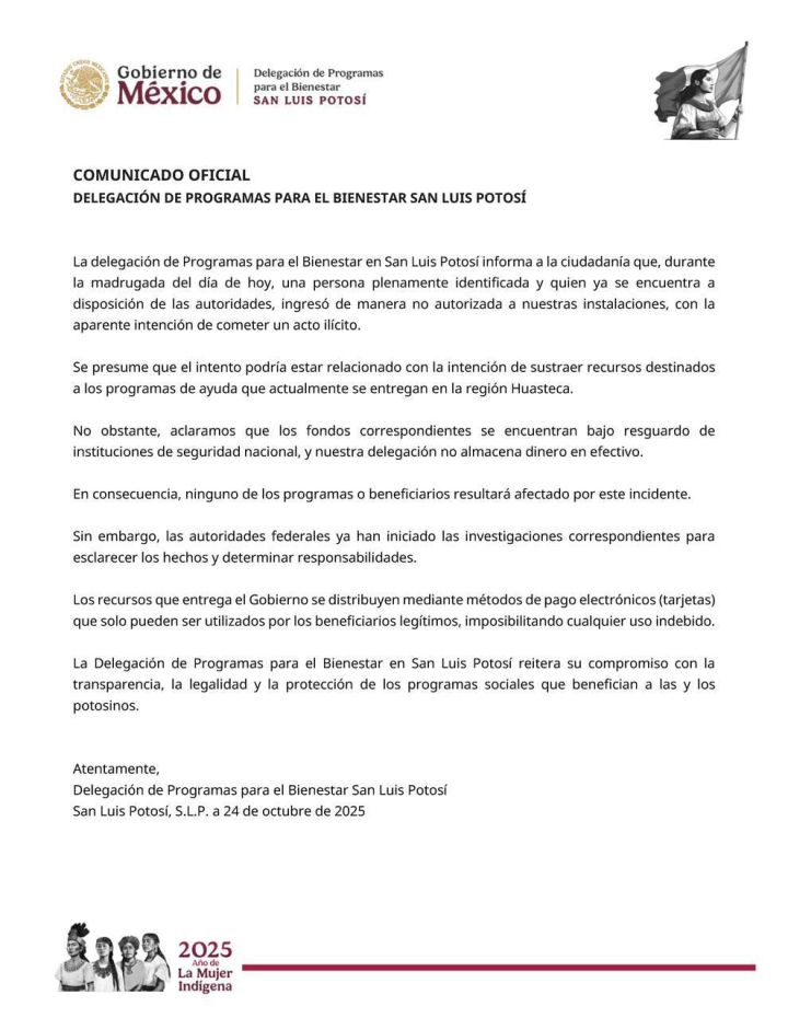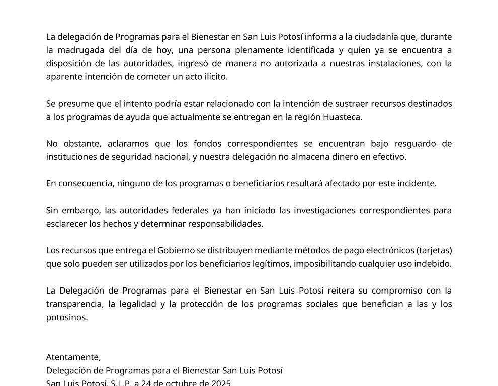 La Delegación de Programas para el Bienestar en San Luis Potosí informó que, durante la madrugada de este viernes, una persona plenamente identificada ingresó de manera no autorizada a las instalaciones de la dependencia con la aparente intención de cometer un acto ilícito.