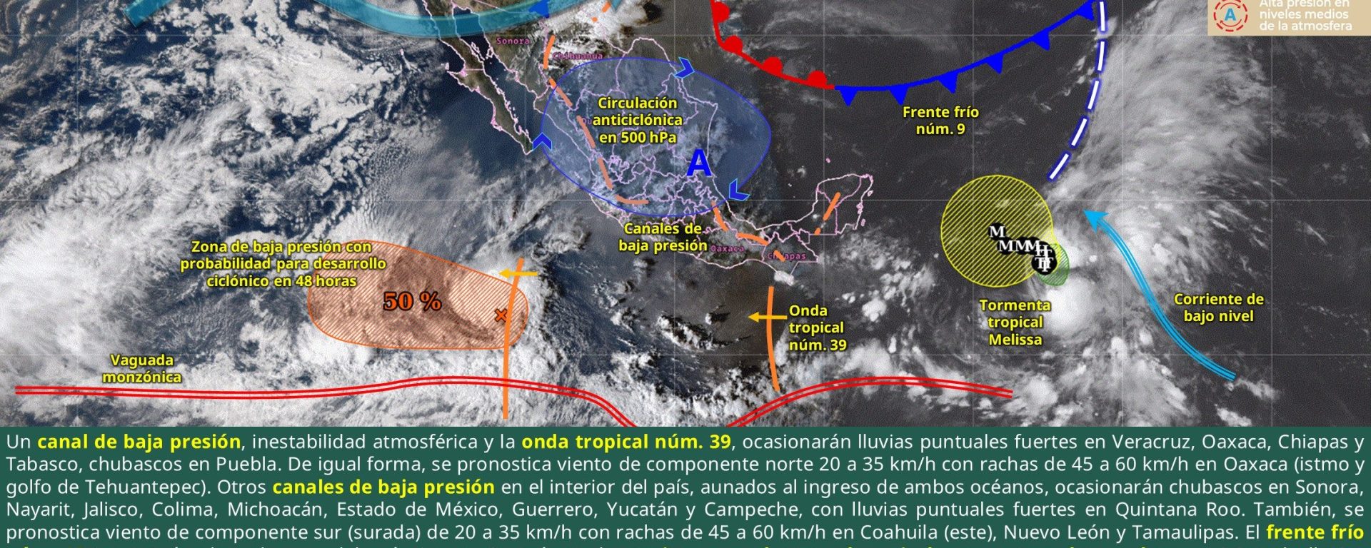 Intervalos de chubascos (5 a 25 mm): Puebla (región Tehuacán-Sierra Negra), Veracruz (región Olmeca), Nayarit (sur), Jalisco (oeste), Colima (norte), Tabasco (oeste y centro), Campeche (oeste) y Quintana Roo (sur).