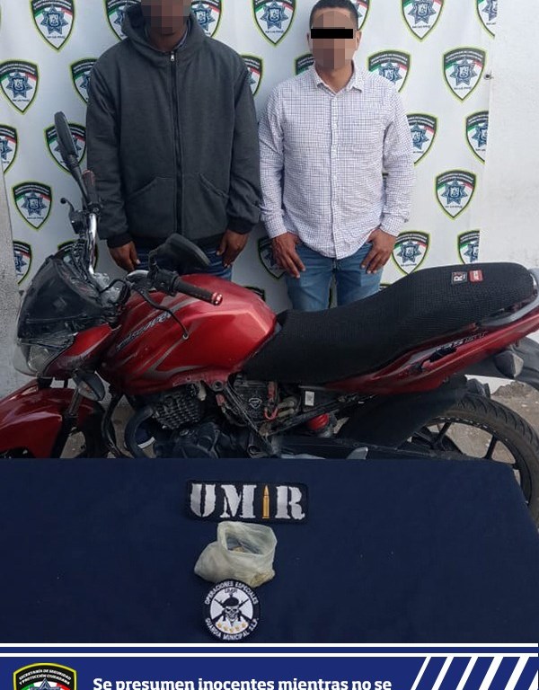 Ante el señalamiento, los oficiales municipales se entrevistaron con los sujetos, quienes mostraron una actitud hostil, uno de ellos empujando a un oficial por los hombros, en tanto el otro sujeto, intentó abordar una motocicleta urbana en color rojo. Ambos fueron asegurados para una revisión preventiva de seguridad.