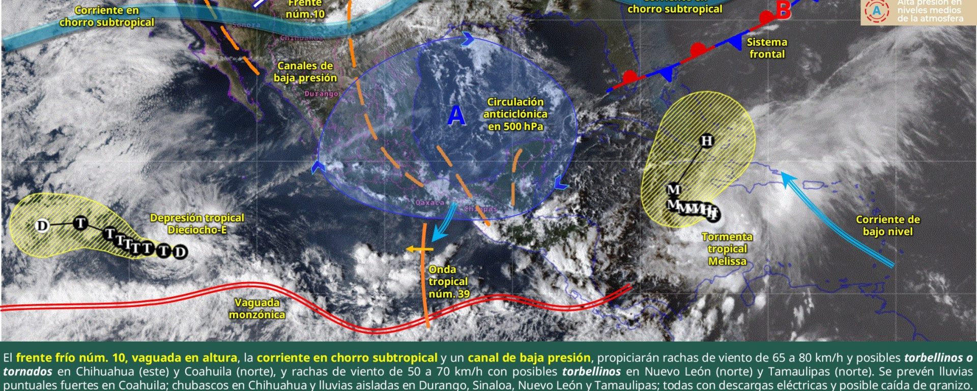 Viento de 25 a 40 km/h con rachas de 55 a 70 km/h y posible formación de torbellinos: norte de Coahuila, Nuevo León y Tamaulipas.