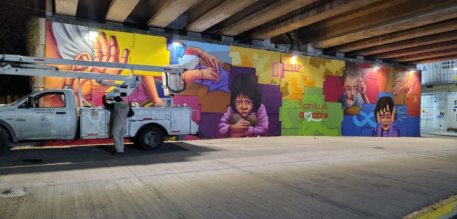 Además, por instrucciones del Alcalde Enrique Galindo Ceballos, la Coordinación de Alumbrado Público reforzó el equipamiento en la glorieta Mariano Jiménez, donde se instalaron cinco reflectores tipo wallpack bajo el puente del lado oriente, frente al mural del DIF Municipal. También se colocaron dos reflectores adicionales en puntos oscuros y se tendieron nuevas líneas eléctricas para alimentar estas luminarias.