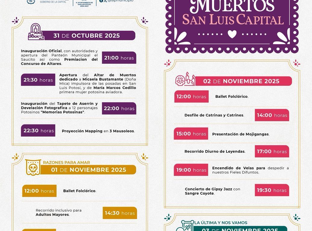 Para disfrutar del Día de Muertos, el Gobierno Municipal realizará el magno evento: Festival Razones para Recordar, la celebración de Día de Muertos en San Luis Capital, cuyas actividades gratuitas comenzarán el viernes 31 de octubre y concluirán hasta el lunes 03 de noviembre.