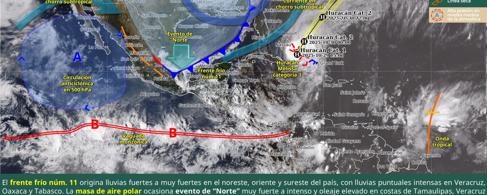 Chubascos con lluvias puntuales fuertes (25 a 50 mm): Veracruz (región Olmeca), Nayarit (costa), Jalisco (oeste), Oaxaca (norte y este), Chiapas (norte), Tabasco (oeste, sur y este) y Campeche (oeste).
