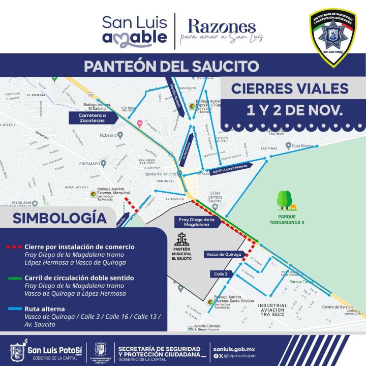 En el panteón del Saucito, que permanecerá abierto las 24 horas los días 1 y 2 de noviembre, la Policía Vial realizará cierre vial en un carril de la avenida Fray Diego de la Magdalena en el tramo de López Hermosa a Vasco de Quiroga por instalación de comercio semifijo, quedando habilitado en doble sentido a la circulación el carril en dirección norte frente al panteón.