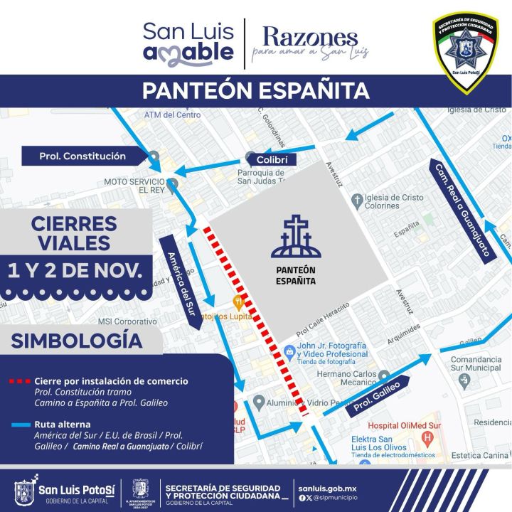 En el panteón Españita, el dispositivo vial se implementará en un horario de las 07:00 a las 19:00 horas, con cierre vial en la avenida Prolongación Constitución en el tramo comprendido de la calle Camino Antiguo a Españita a República de Bolivia por instalación de comercio semifijo.