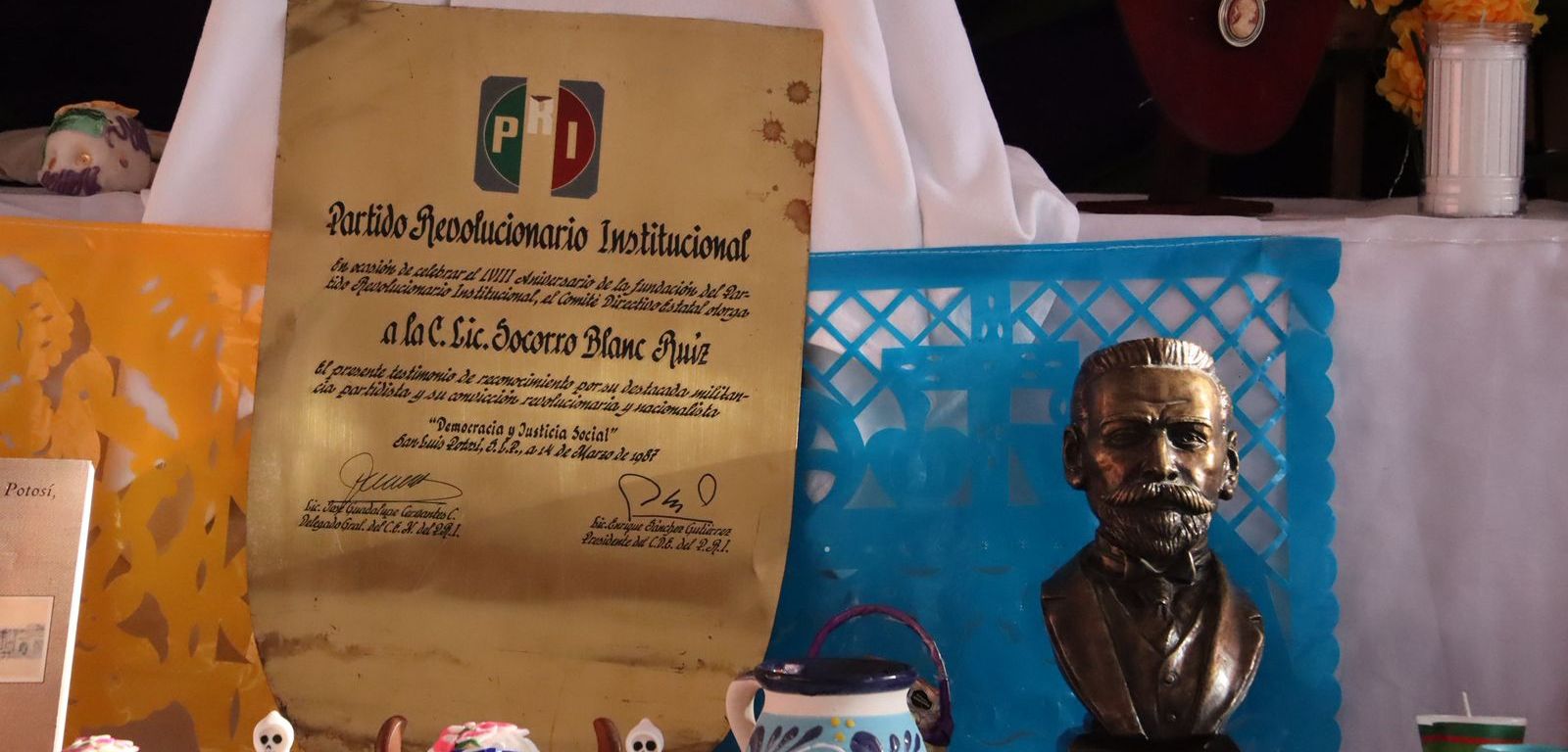 El Partido Revolucionario Institucional (PRI) en San Luis Potosí ha dedicado su altar de muertos a María del Socorro Blanc Ruiz, reconocida como la primera mujer alcaldesa interina de San Luis Potosí y de México.