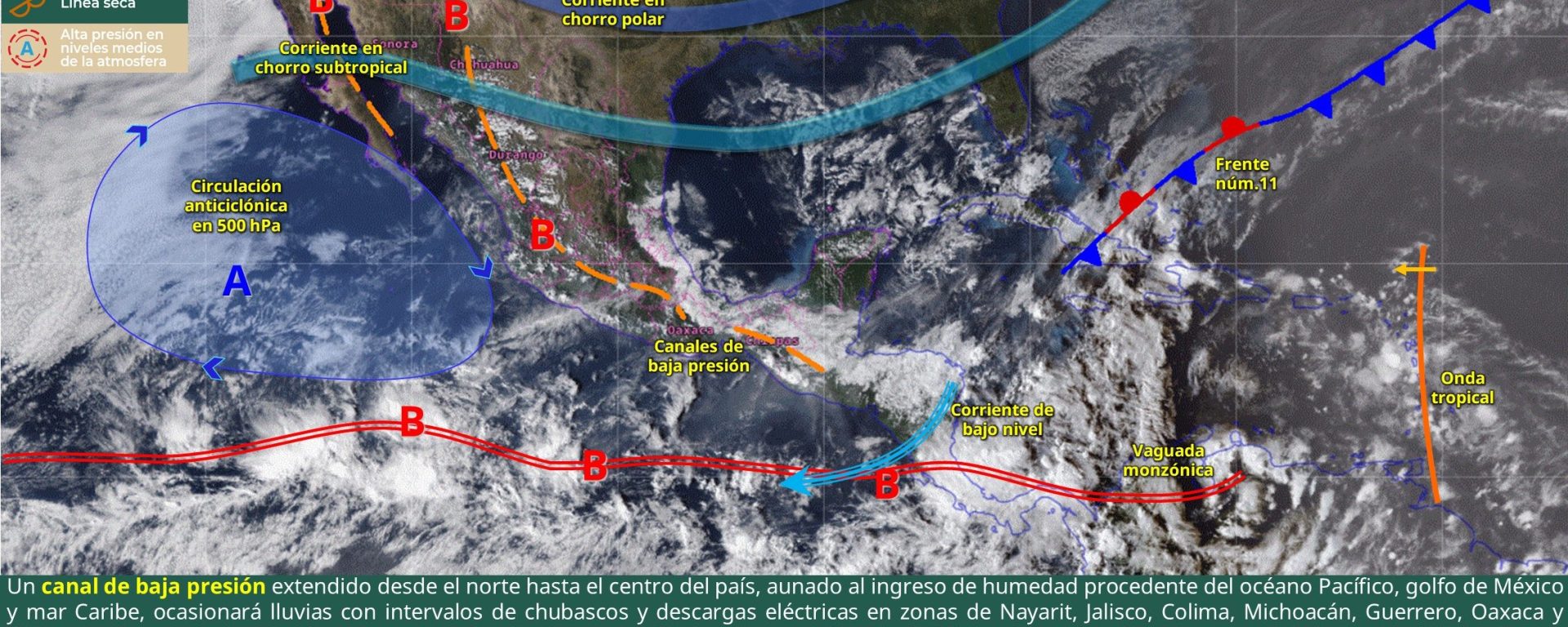 Oleaje de 1.5 a 2.5 metros de altura: costas de Jalisco, Colima, Michoacán, Guerrero, Oaxaca y Chiapas.