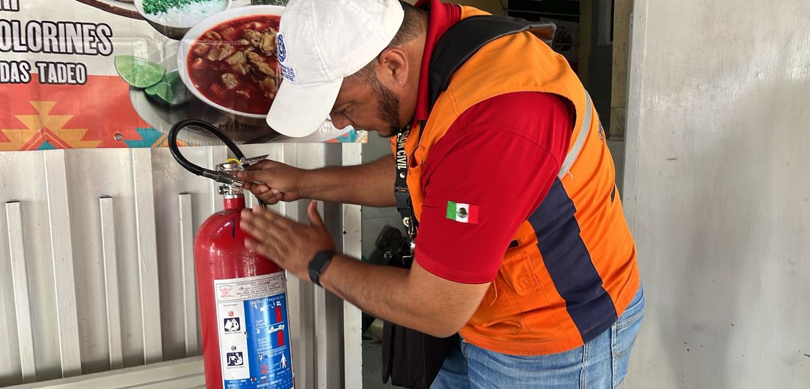 Durante las acciones, se verifica que los extintores se encuentren vigentes, que se cuente con botiquines de primeros auxilios y que los tanques de gas dispongan de su regulador y manguera de uso rudo, garantizando así condiciones seguras tanto para comerciantes como para visitantes.