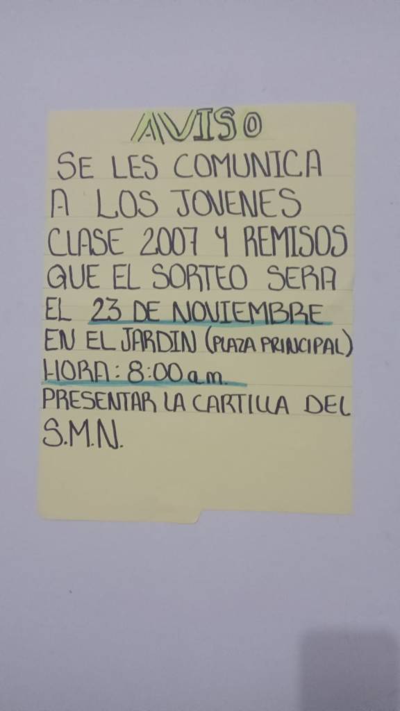 CIUDAD VALLES, S.L.P. – El H. Ayuntamiento de Ciudad Valles, a través de la Junta Municipal de Reclutamiento, que dirige Alfredo Contreras Rodríguez, informa que el sorteo del Servicio Militar Nacional (SMN) se estará llevando a cabo el próximo domingo 23 de noviembre, a las 08:00 de la mañana, en la Plaza Principal. Se les pide a los jóvenes de Clase 2007 y Remisos que presenten su pre-cartilla.