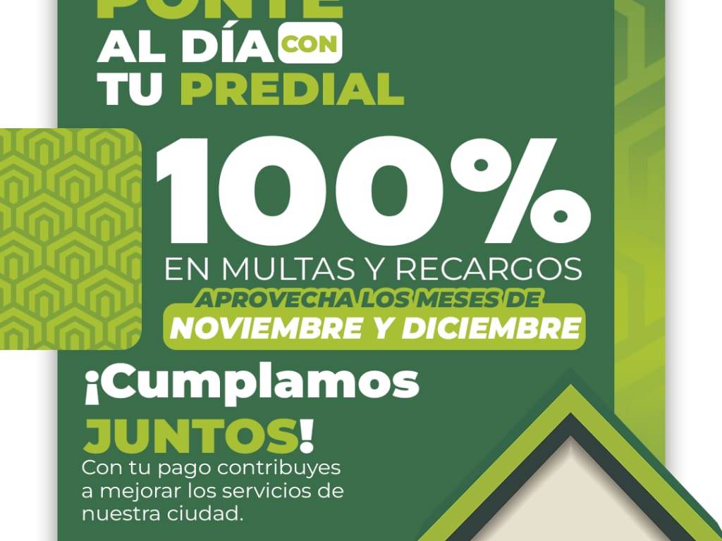 El H. Ayuntamiento de Ciudad Valles, a través de la Tesorería Municipal, invita a la ciudadanía a aprovechar el beneficio del 100% de descuento en multas y recargos del impuesto predial, durante los meses de noviembre y diciembre del presente año.