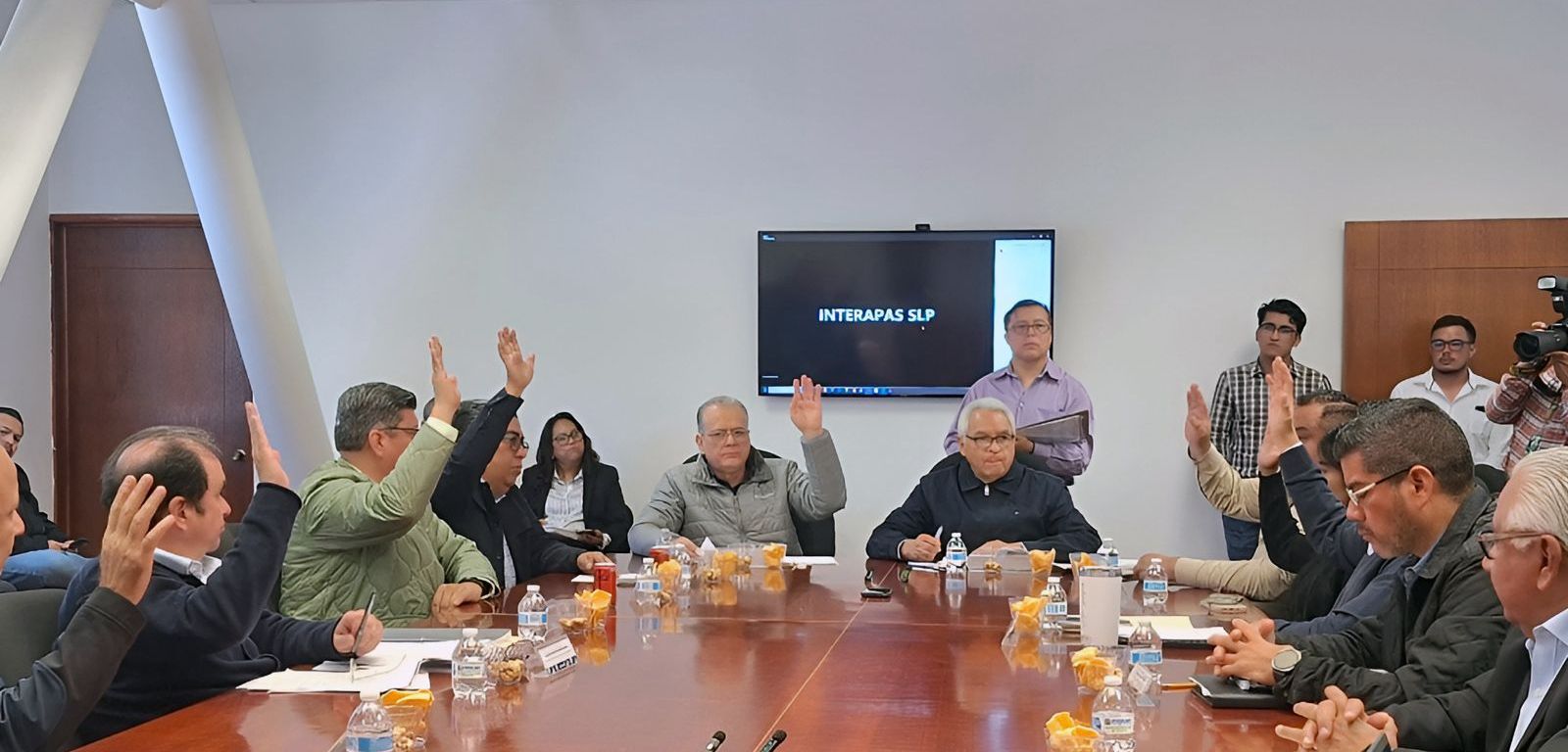 En la junta de gobierno de INTERAPAS estuvieron presentes el presidente municipal de Soledad de Graciano Sánchez Juan Manuel Navarro Muñiz, Cerro de San Pedro Ángel de Jesús Nava Loredo y el secretario del Ayuntamiento de San Luis Potosí Fernando Chávez Méndez en representación del alcalde Enrique Galindo y sus respectivos regidores, además de Héctor Mario Hinojosa Muñiz representante de usuarios domésticos y Fernando Díaz León, dirigente de Canaco.