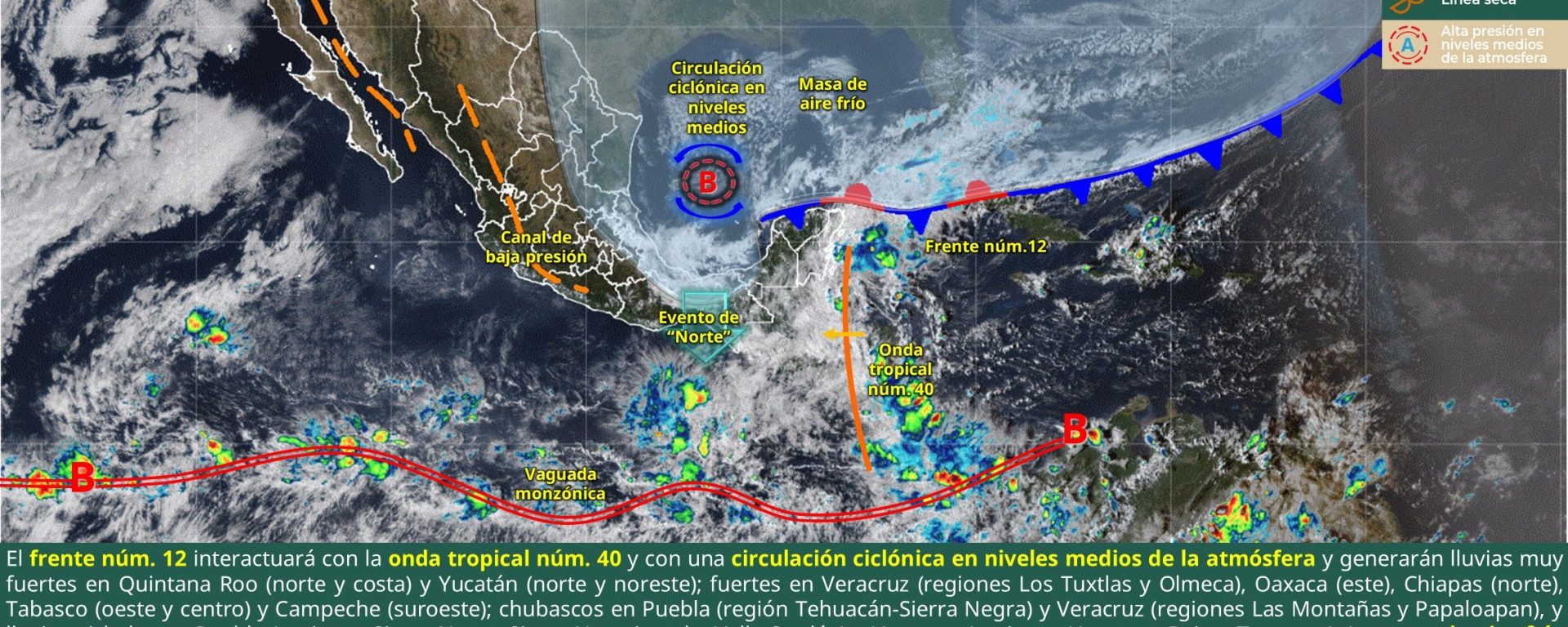 Chubascos con lluvias puntuales fuertes (25 a 50 mm): Chiapas (norte), Tabasco (norte, centro y oeste), Veracruz (región Olmeca) y Oaxaca (este).