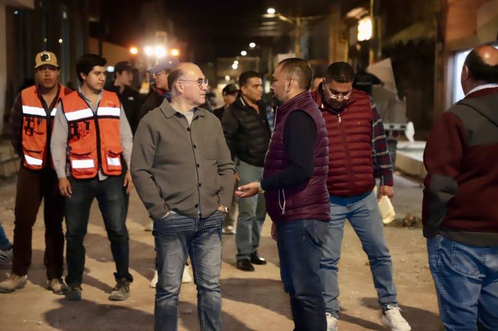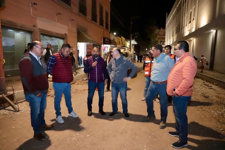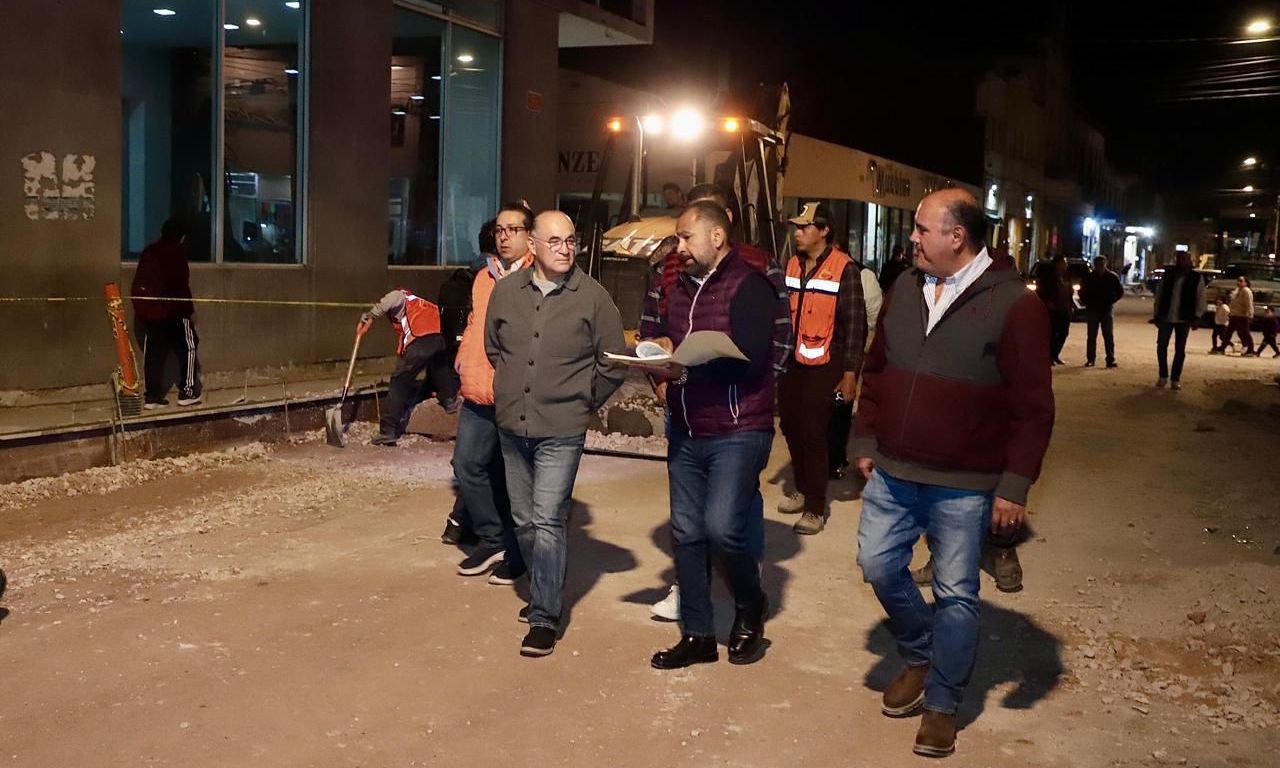 El Presidente Municipal supervisó los trabajos nocturnos en el Centro Histórico; las banquetas estarán listas en una semana y la calle será transitable en diciembre.