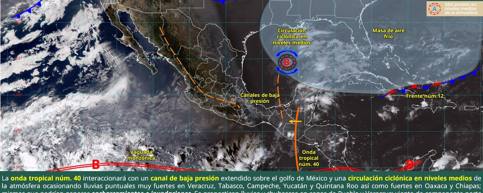 Chubascos con lluvias puntuales fuertes (25 a 50 mm): Oaxaca (suroeste), Tabasco (norte, centro y oeste), Chiapas (norte, este y sur), Campeche (oeste), Yucatán (norte y este) y Quintana Roo (norte y costa).