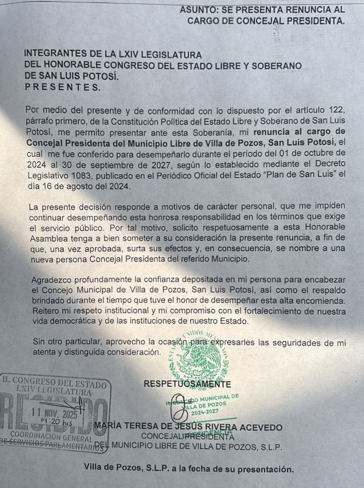 La renuncia de Rivera Acevedo fue confirmada por el secretario general del Ayuntamiento de Villa de Pozos, René Oyarvide Ibarra, quien explicó que la decisión obedece a motivos personales, luego de encabezar durante más de un año los trabajos administrativos y de organización institucional de la nueva demarcación.