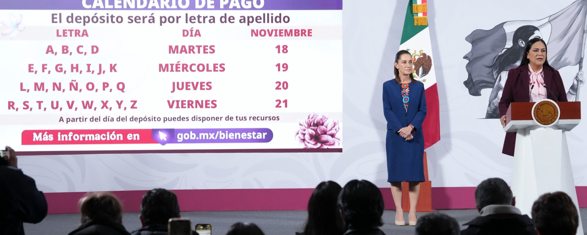 En la conferencia matutina: “Las mañaneras del pueblo”, que encabeza la Presidenta de México, Claudia Sheinbaum Pardo, la secretaria de Bienestar, Ariadna Montiel Reyes, detalló que el depósito se realizará de acuerdo con la letra del primer apellido bajo el siguiente calendario: