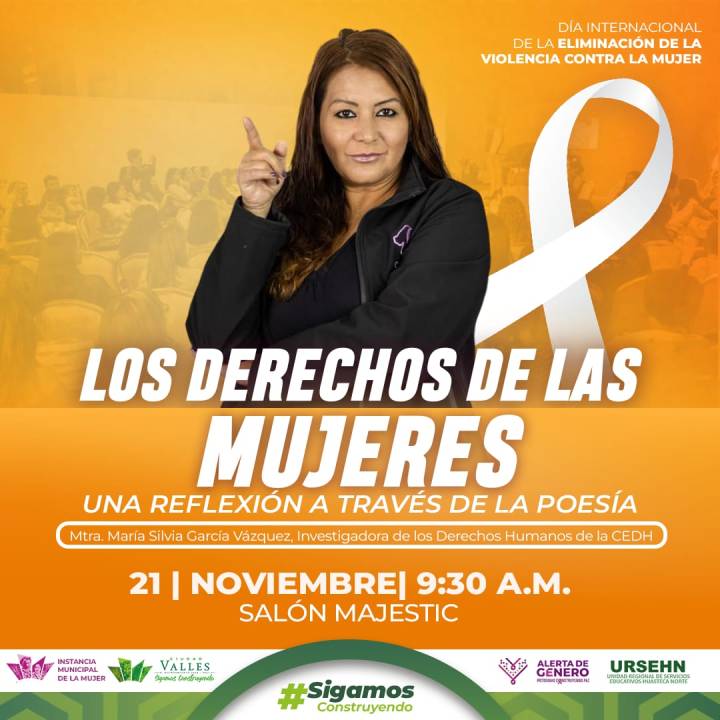 La Instancia Municipal de la Mujer, del H. Ayuntamiento de Ciudad Valles, a cargo de la Maestra Rebeca Terán Guevara, invita a la ciudadanía a participar en las actividades conmemorativas por el Día Internacional de la Eliminación de la Violencia Contra la Mujer, que se llevarán a cabo este viernes 21 de noviembre, con el propósito de fomentar la reflexión, el respeto y la protección de los derechos de las mujeres.