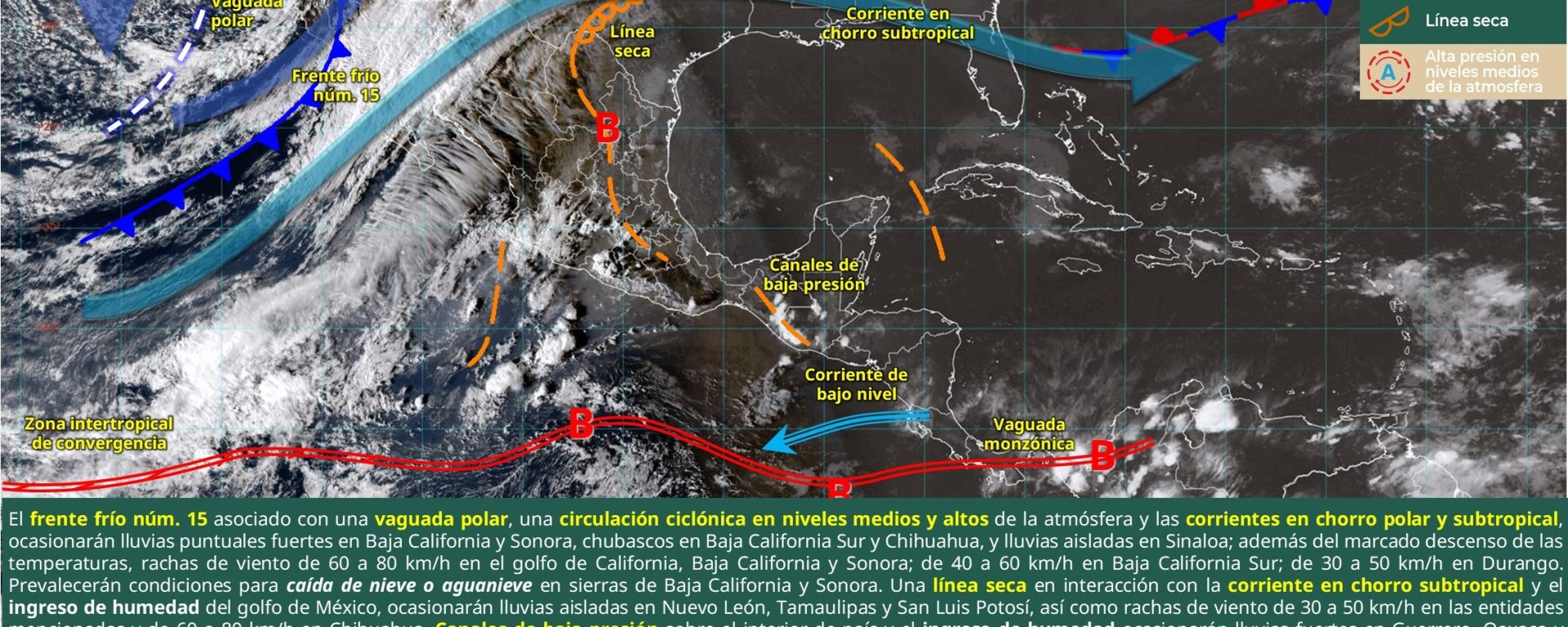 Posible caída de nieve o aguanieve: Sierras de Baja California, Sonora y Chihuahua, y durante la noche de este día y madrugada del jueves: sierras de Sinaloa (norte) y Durango (norte).