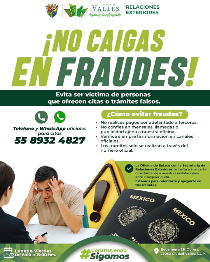 CIUDAD VALLES, S.L.P. – El H. Ayuntamiento de Ciudad Valles, a través de la Oficina Municipal de Enlace con la Secretaría de Relaciones Exteriores, que dirige la Lic. Griselda Martínez Gómez, hace un llamado a la ciudadanía para que evite caer en falsos gestores de trámites y páginas de Internet fraudulentas, que solo engañan y estafan a la ciudadanía que busca obtener su pasaporte.