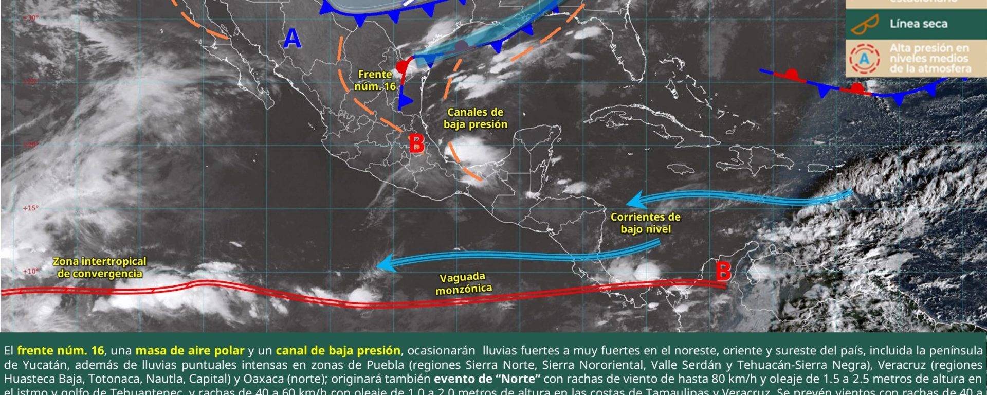 Evento de “Norte” de 40 a 50 km/h con rachas de 60 a 80 km/h: Oaxaca y Chiapas (istmo y golfo de Tehuantepec); de 20 a 30 km/h con rachas de 40 a 60 km/h: Tamaulipas y Veracruz.