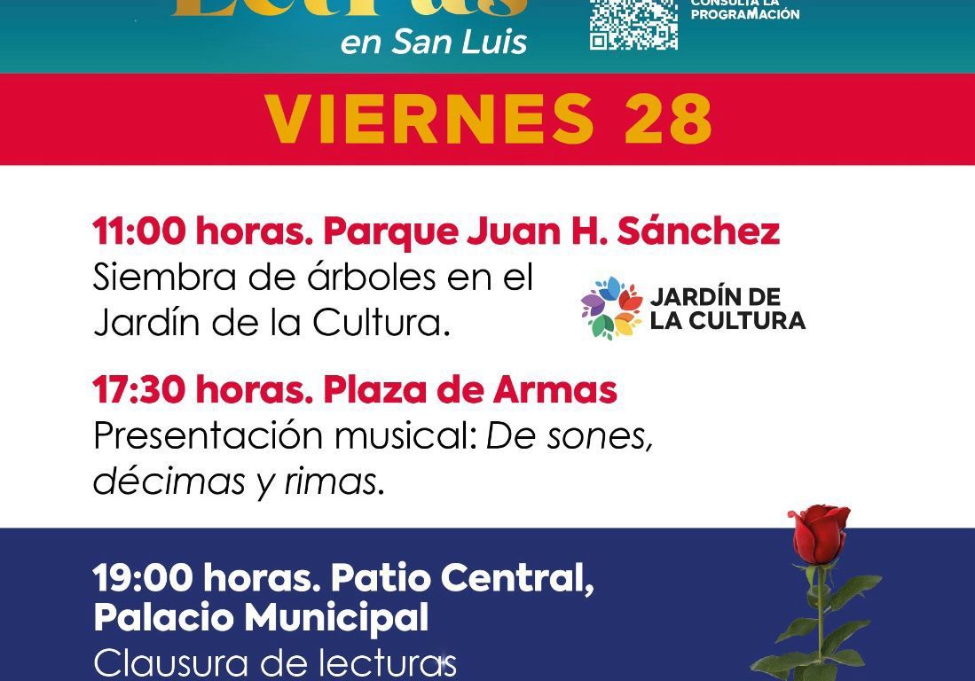 El Gobierno Municipal de San Luis Potosí, gracias al impulso del alcalde Enrique Galindo Ceballos y al director de Cultura Municipal, Martín Juárez Córdova, invita a la ciudadanía a participar en las actividades programadas para este viernes 28, día de clausura del XVIII Festival Internacional Letras en San Luis, uno de los encuentros literarios más importantes del estado.