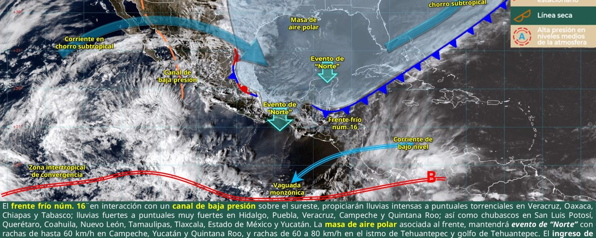 Oleaje de 1.5 a 2.5 metros de altura: golfo de Tehuantepec, costas de Tamaulipas, Veracruz, Tabasco, Campeche, Yucatán y Quintana Roo, disminuyendo en el transcurso del día.