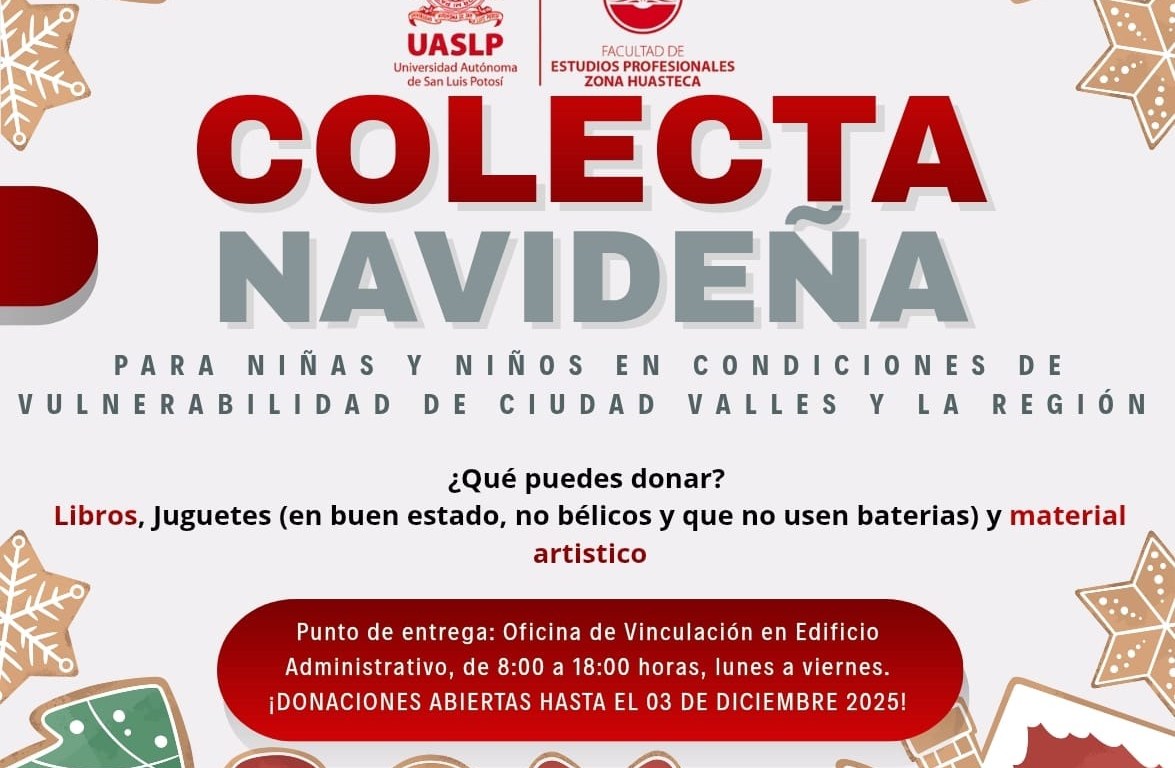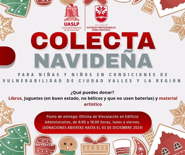 La Facultad de Estudios Profesionales de la Zona Huasteca (FEPZH) Campus Valles invita a la población a participar en la Colecta Navideña de Juguetes 2025, iniciativa dirigida a niñas y niños en situación de vulnerabilidad, con el propósito de entregarles un juguete que no utilice pilas. Así lo informó el director del Campus, Lic. Isaac Lara Azuara.