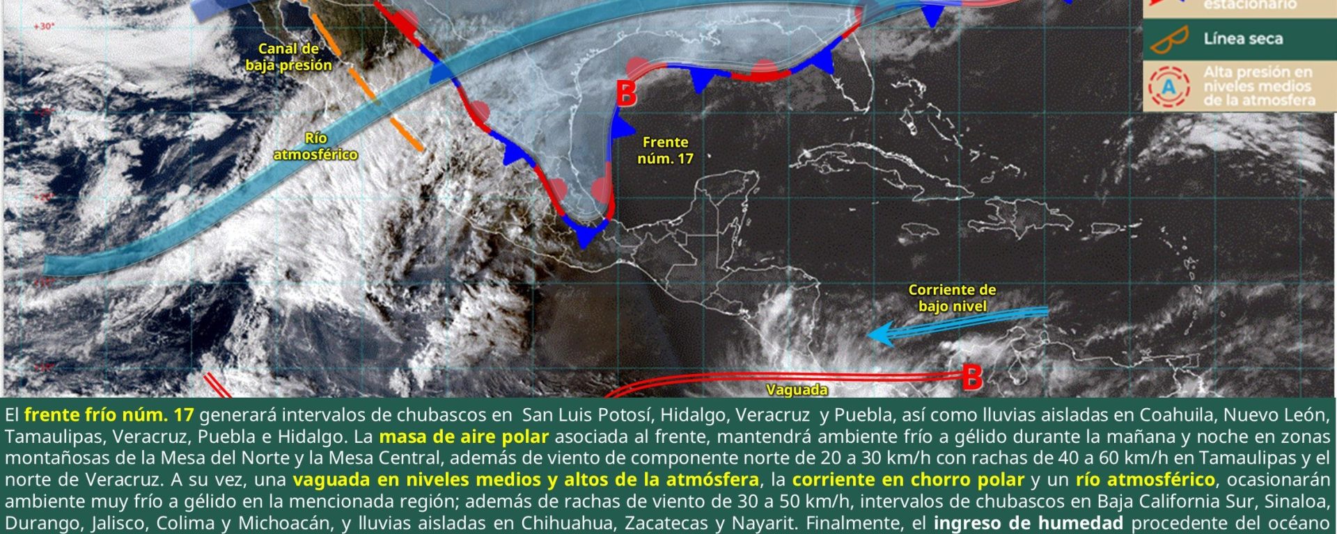 Viento de 20 a 30 km/h con rachas de 40 a 60 km/h: Sonora, Chihuahua, Coahuila, Durango, Zacatecas, Jalisco, Aguascalientes, San Luis Potosí, Querétaro, Hidalgo, Tlaxcala y Puebla.