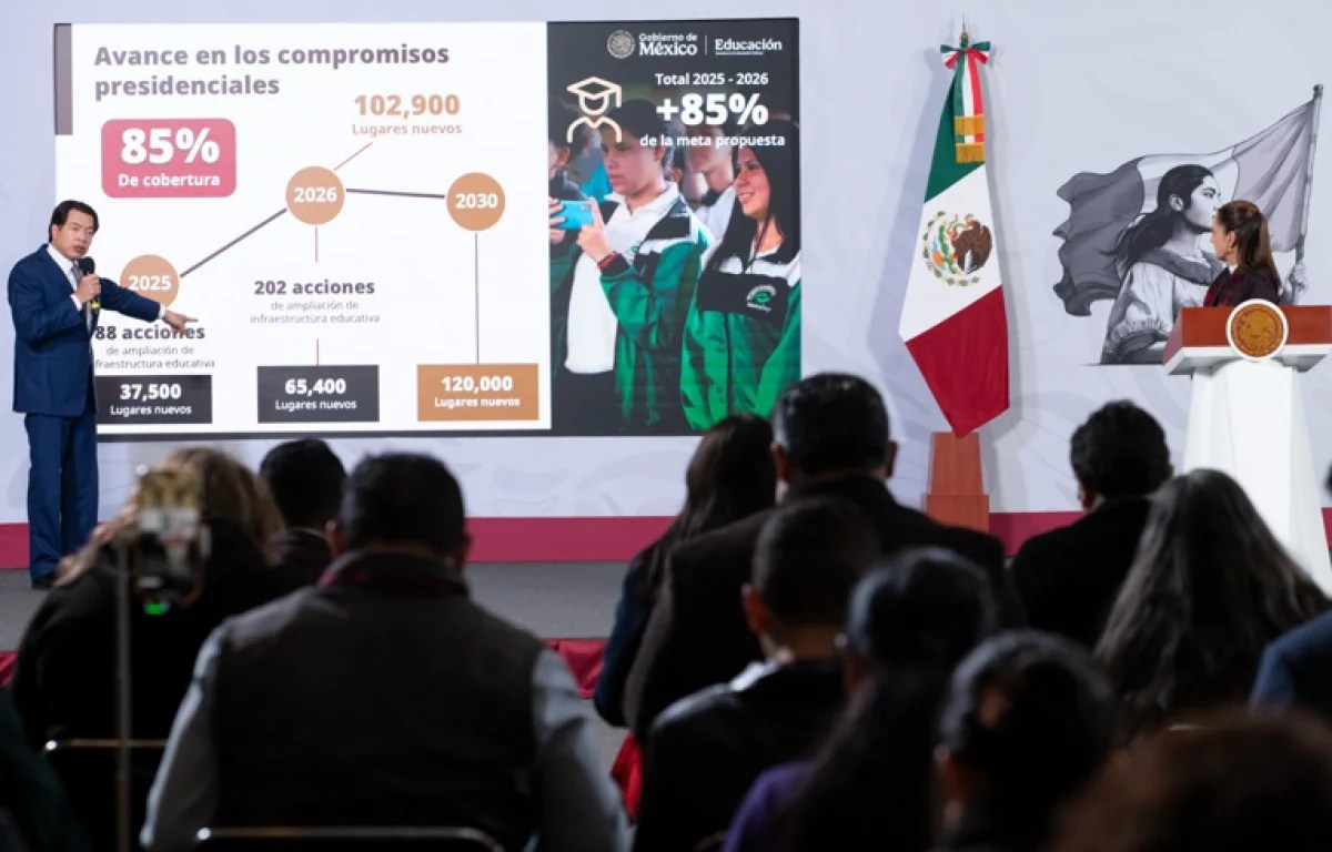 Ciudad de México, 8 de diciembre de 2025.- La Presidenta de México, Claudia Sheinbaum Pardo, destacó que la creación de nuevos espacios en Educación Media Superior presenta un avance del 37 por ciento, de la meta sexenal de 150 mil nuevos lugares, indicador que en 2026 seguirá creciendo gracias al Plan Integral del Sistema Nacional del Bachillerato que contempla 20 Bachilleratos Tecnológicos, 52 ampliaciones en 31 entidades y 130 Ciberbachilleratos en 107 municipios para que las escuelas queden cerca de los hogares de las y los estudiantes.