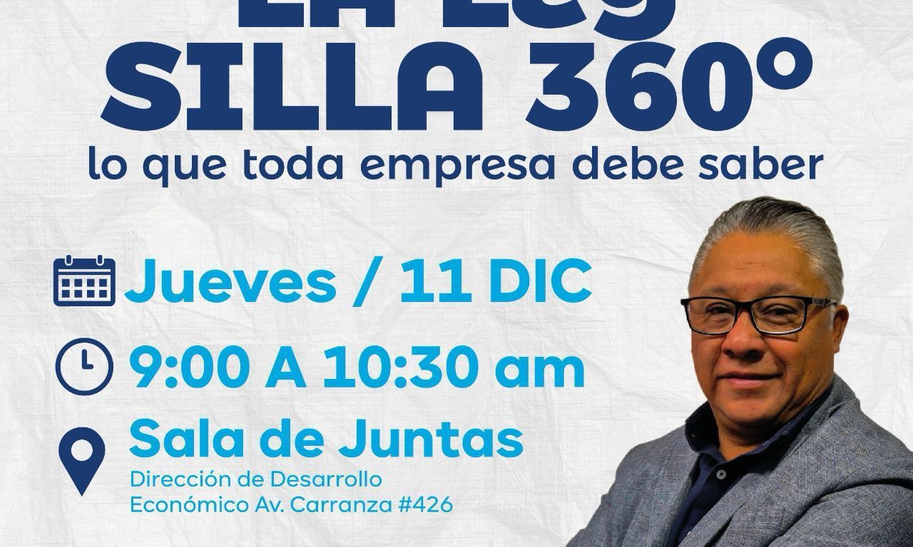 Con el propósito de fortalecer el cumplimiento normativo y promover condiciones laborales más dignas dentro de las empresas, el Gobierno Municipal que encabeza el Alcalde Enrique Galindo Ceballos, a través de la Dirección de Desarrollo Económico, llevará a cabo la capacitación “Ley Silla 360°: lo que toda empresa debe saber”, dirigida a empleadores, responsables de recursos humanos, áreas administrativas y público interesado.
