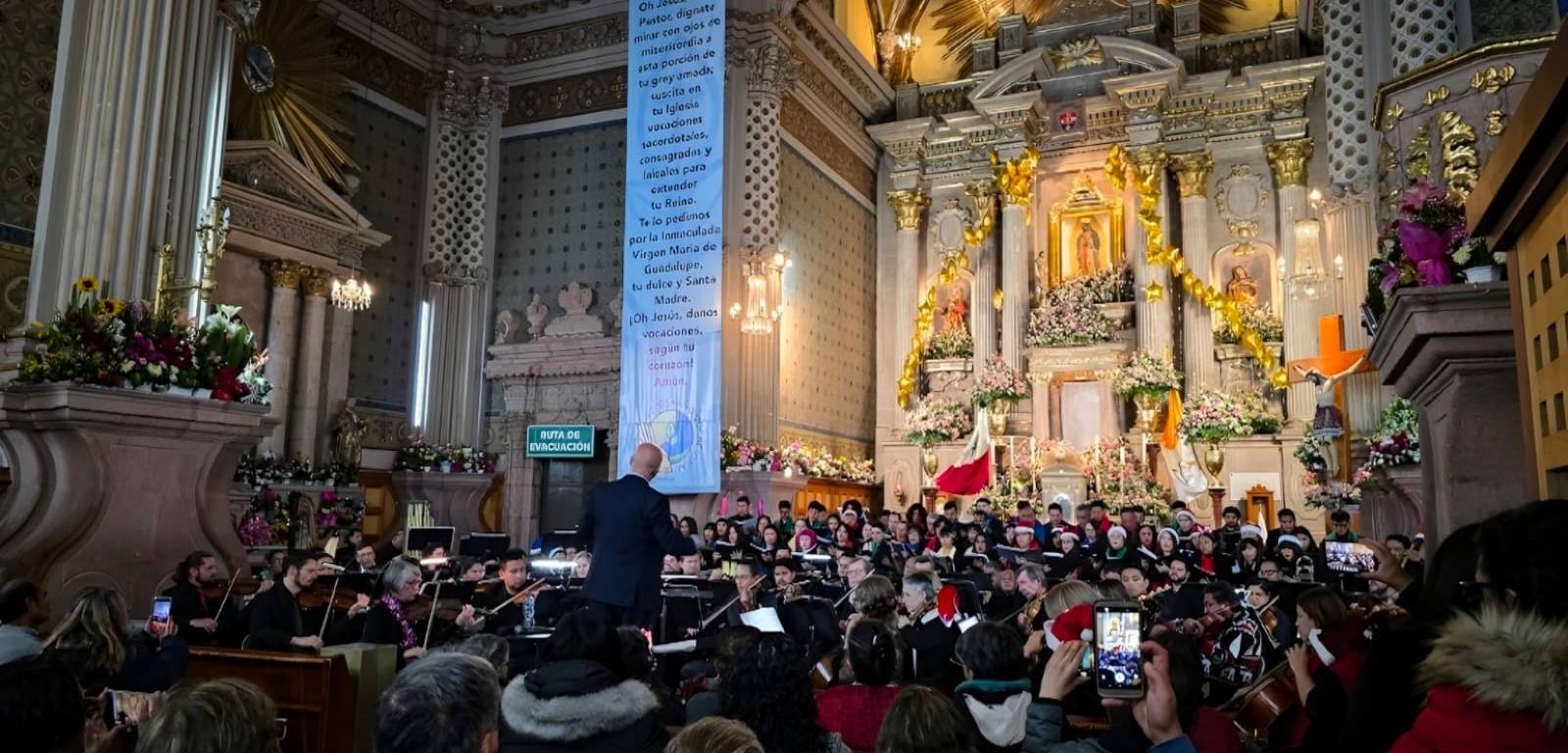 Con éxito y una destacada respuesta del público asistente, se presentó la Orquesta Sinfónica de San Luis Potosí en el Santuario de la Basílica de Guadalupe, como parte de la serie de conciertos que la Secretaría de Cultura del Gobierno del Estado promueve durante la temporada decembrina en distintos templos de la ciudad.