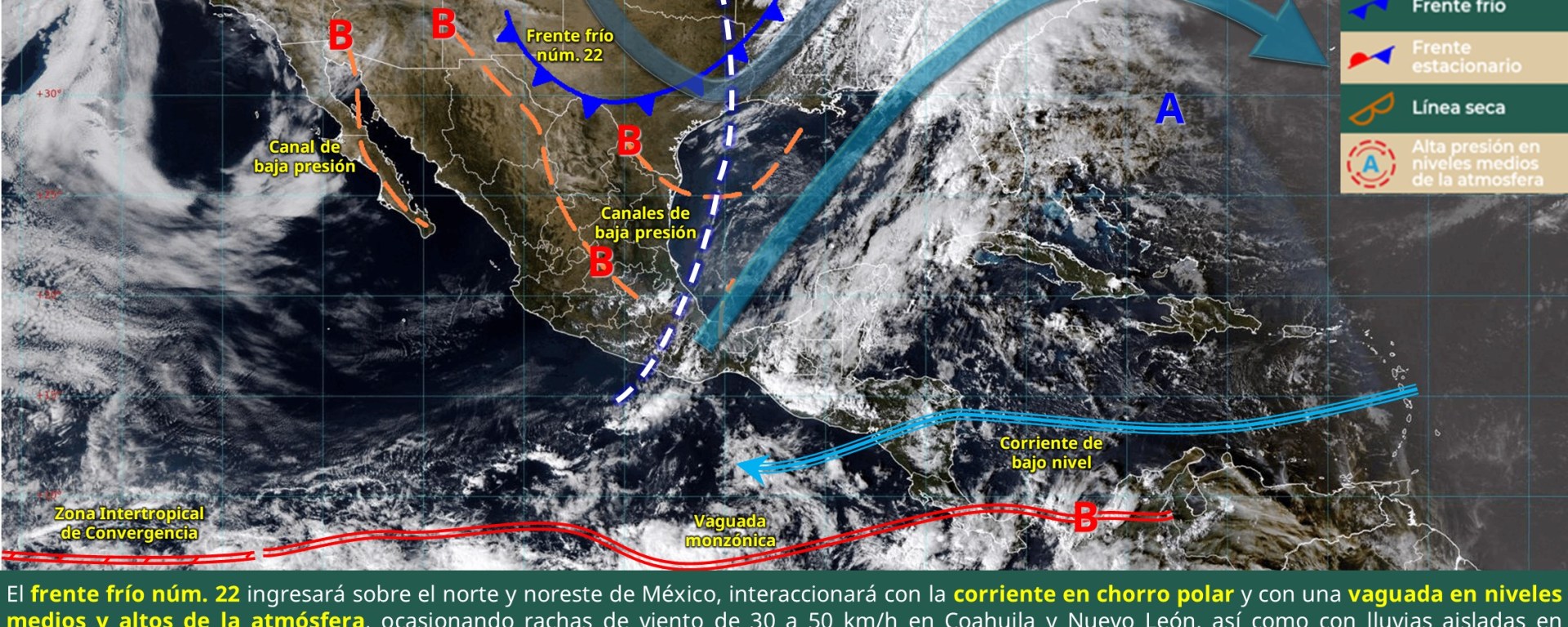 Viento de componente norte de 40 a 50 km/h con rachas de 60 a 80 km/h: Oaxaca (istmo y golfo de Tehuantepec); de 20 a 30 km/h con rachas de 40 a 60 km/h: Tamaulipas y Veracruz.