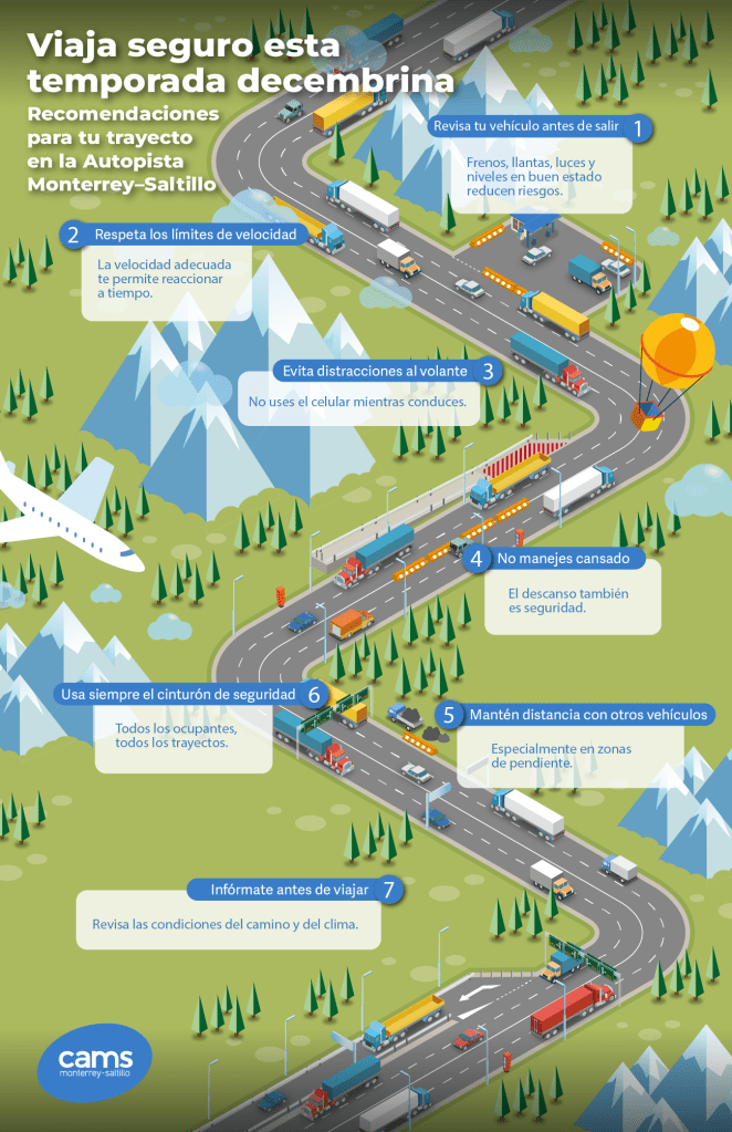 La Autopista Monterrey–Saltillo es uno de los corredores más relevantes para la conexión industrial, comercial y turística del noreste del país, por lo que CAMS hace un llamado a los conductores a extremar precauciones, seguir la señalización y adaptar su conducción a las condiciones de la temporada.