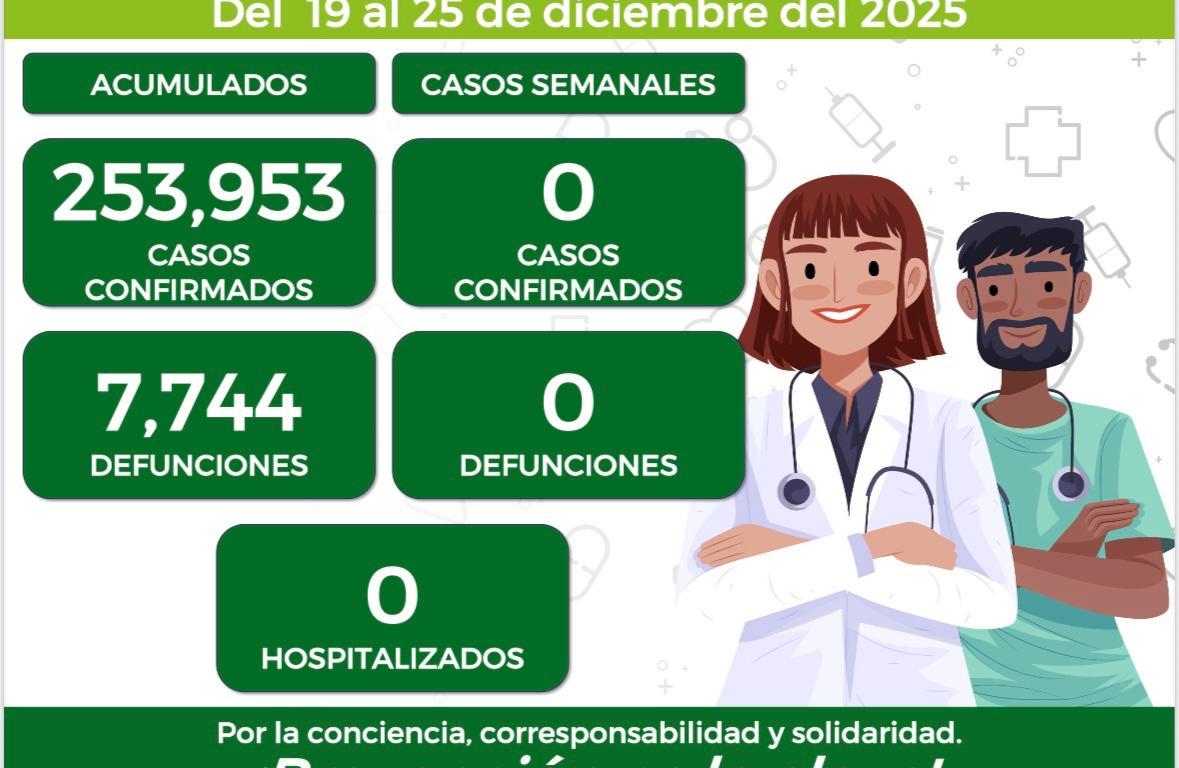 El Comité Estatal para la Seguridad en Salud y los Servicios de Salud del Gobierno del Estado informan que, del 19 al 25 de diciembre del presente año, no se registraron casos nuevos por contagio de COVID-19 confirmando 253 mil 953 casos totales de esta enfermedad en la entidad potosina.