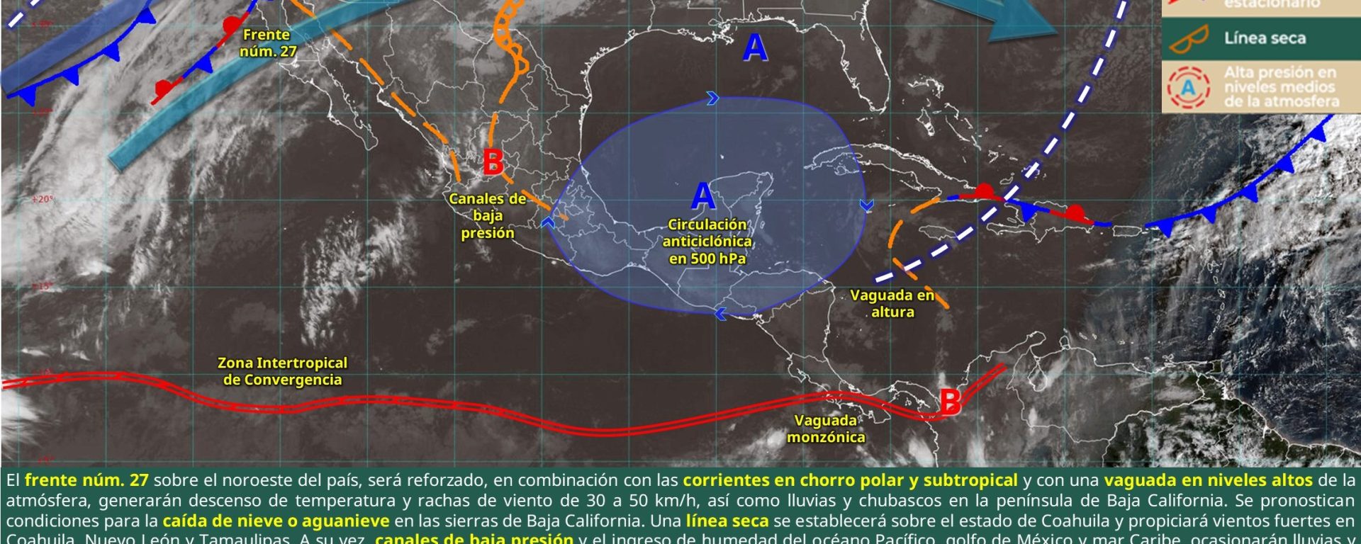 Cielo medio nublado a nublado en el transcurso del día y sin lluvia en la región. Por la mañana, ambiente frío a muy frío con heladas en zonas serranas, así como gélido en zonas montañosas de Durango y Chihuahua. Durante la tarde, ambiente templado a cálido en la región, y templado en zonas altas. Viento de componente sur de 10 a 20 km/h con rachas de 30 a 50 km/h en Coahuila y Nuevo León, y de dirección variable con rachas de igual intensidad en Chihuahua y Durango.