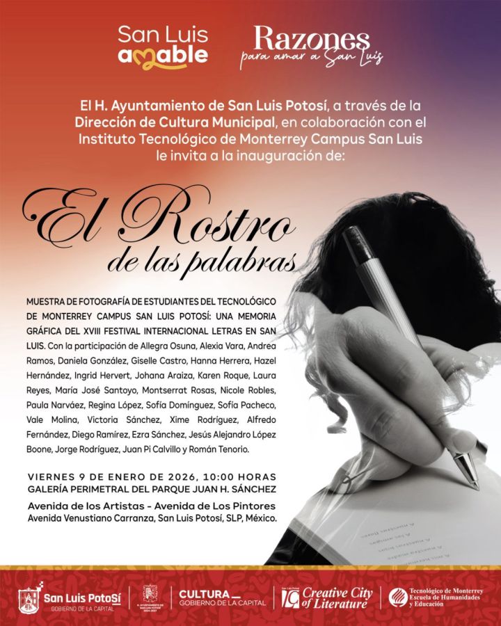 Gracias al impulso del alcalde Enrique Galindo Ceballos, el Gobierno Municipal de San Luis Potosí, a través de la Dirección de Cultura Municipal y en colaboración con el Tecnológico de Monterrey Campus San Luis Potosí, invita a la inauguración de la exposición fotográfica El Rostro de las Palabras, una muestra integrada por 56 imágenes que rinden homenaje a la literatura contemporánea a través del retrato fotográfico. La inauguración se llevará a cabo el viernes 9 de enero de 2026, a las 10:00 horas, en la Galería Perimetral del Parque Juan H. Sánchez.